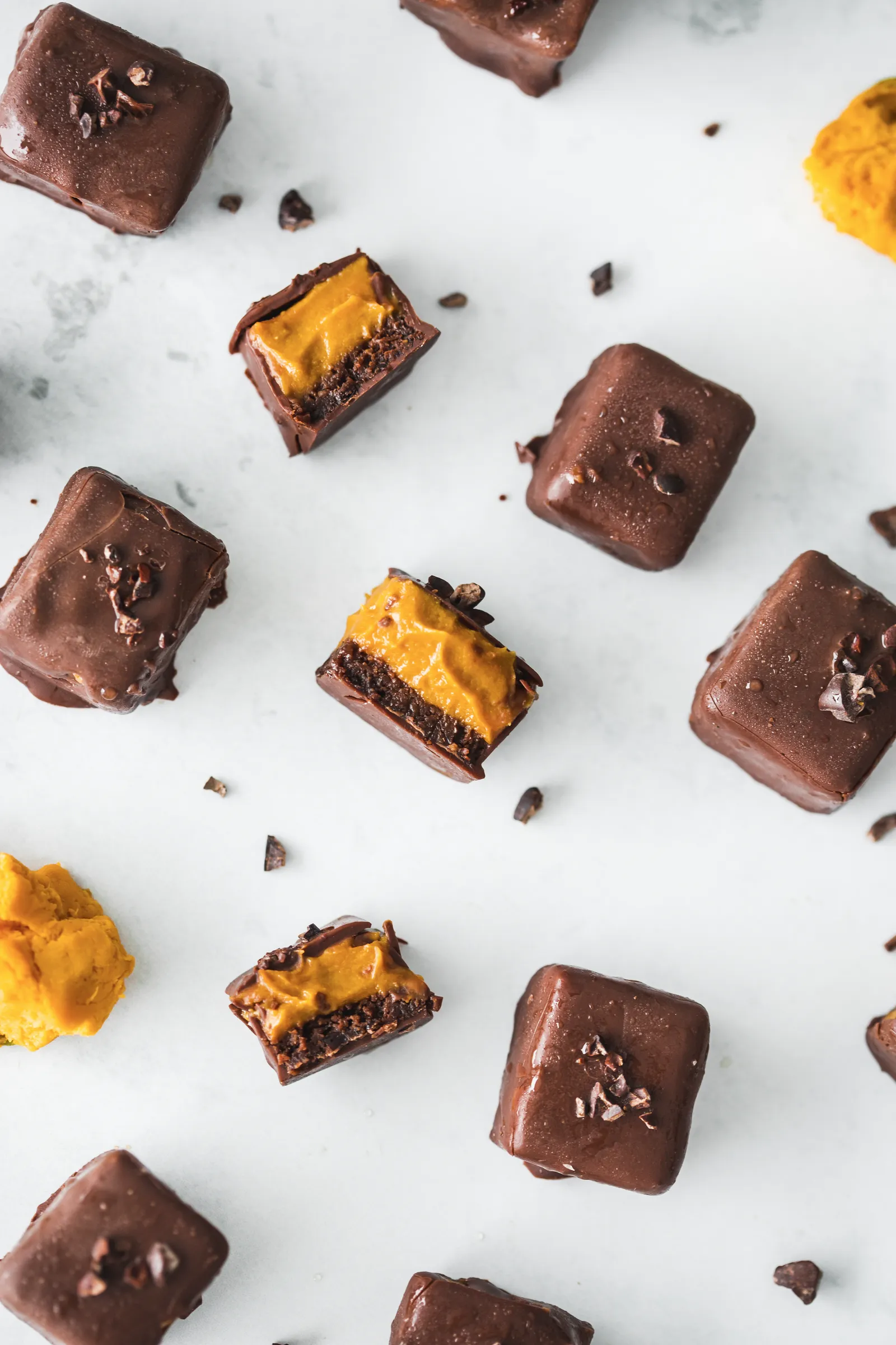 Discos de bizcocho húmedo de zanahoria y pecanas troceadas, elaborado con harina de almendras, huevos ecológicos y especias. Relleno y cubierto por manjar artesanal de coco y trozos de pecanas.