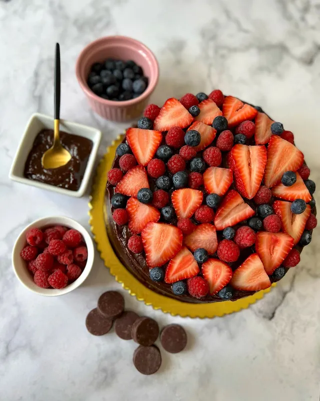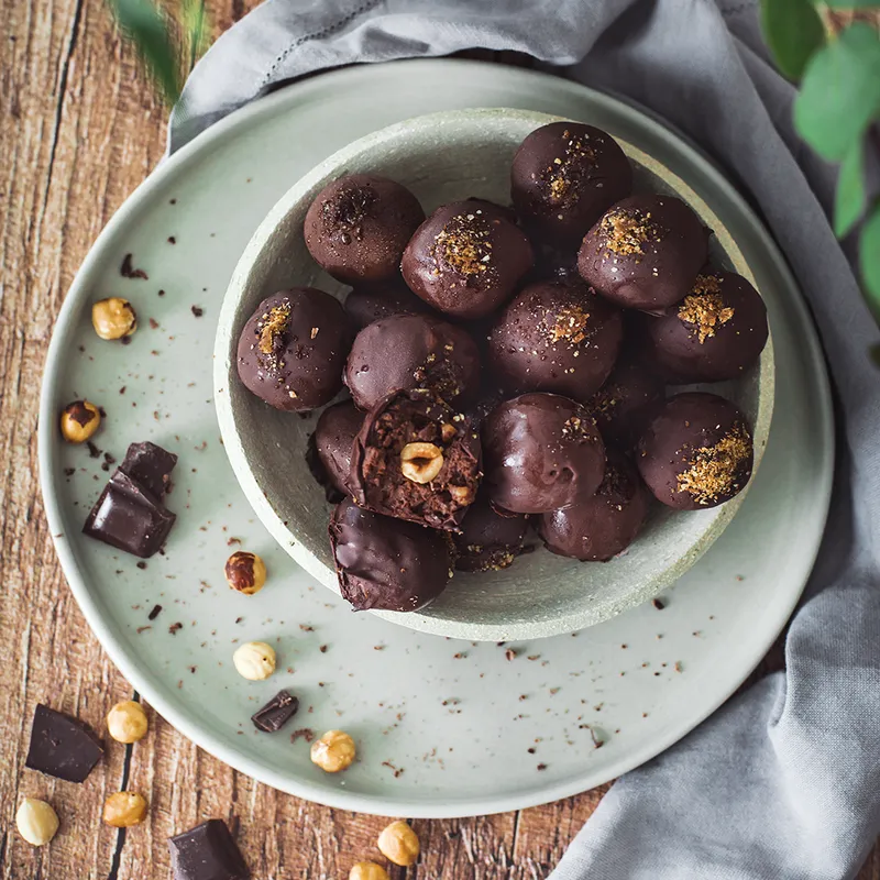 Queque marmoleado de plátano y cacao, endulzado con panela, huevos ecológicos, harina de plátano, harina de yuca, almidón de yuca y aceite de coco. Decorado con una capa crujiente de chocolate al 70% y nueces.